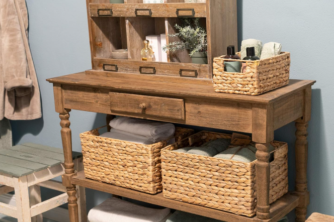 Woven baskets are one of the simplest ways to make a small bathroom look instantly more organized. They hide clutter, soften the space visually, and make open shelving feel intentional instead of messy.