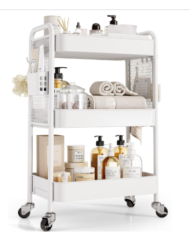 A narrow rolling storage cart is one of the best small bathroom storage solutions because it fits into spaces that usually go unused — like the gap between the toilet and vanity or next to a cabinet.